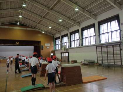 体育館で跳び箱運動をしました。
