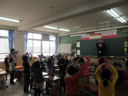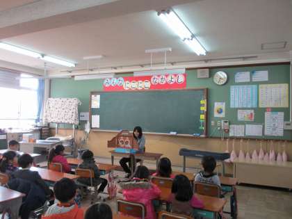 1年1組の教室で出席をとったり,歌を歌ったり,紙芝居の読み聞かせを聞いたりしました。