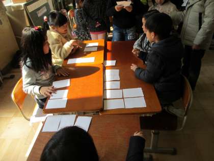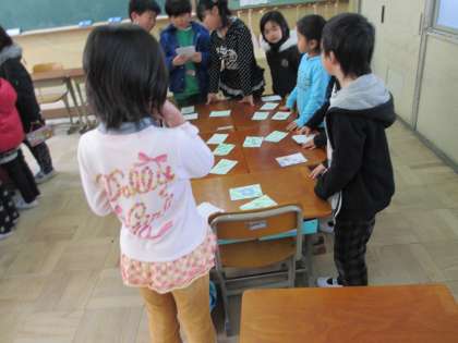 その時に作ったかるたを持って,一年生に教えにいきました。