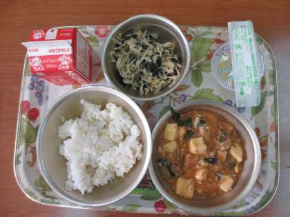 今日の給食は,「麦ごはん・牛乳・とうふの四川風・切干大根のいためナムル・リンゴゼリー」です。切干大根のいためナムルは,「ほうれん草ともやしのナムル」と比べて歯ごたえがありしゃきしゃきしています。