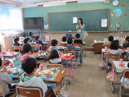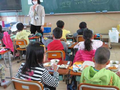 今日は給食開始の日でした。一年生にとっては小学校で初めての給食です。みんなで楽しく,おいしくいただきました。