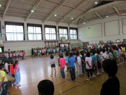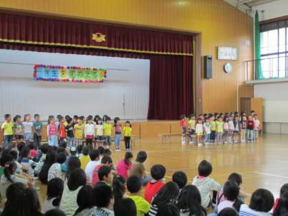各学年からのプレゼントのあとは,1年生から「はる」の音読を発表しました。その後,全校合唱で「すてきな友達」を歌いました。