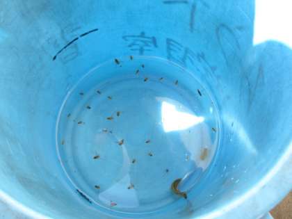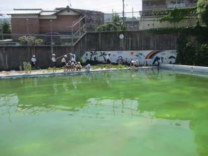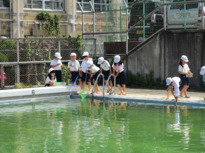 2年生は,学校のプールの中にいる生き物をさがしました。ヤゴやアメンボなどを見つけることができました。