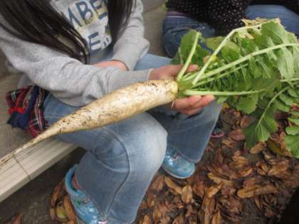 2月17日(火),2年1組では,算数の学習で「1000をこえる数」の復習をしました。2年2組では,生活科で育てた大根を一人ずつ抜きました。形はいろいろでしたが,おいしそうでした。