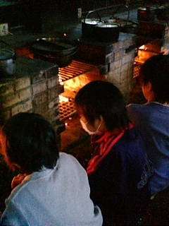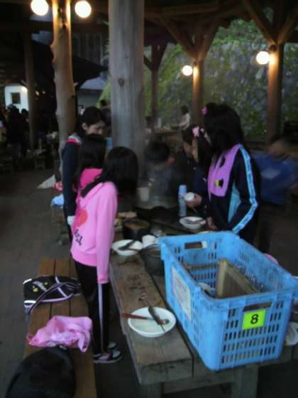 ご飯が炊きあがり、豚汁もできました。みんな自分達の作った料理を美味しくいただいています。午後6時現在、気温は6度です。寒いですが、みんな元気に魚を焼いて食べています。