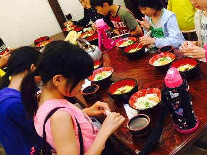 中野うどん学校に戻って昼食です。階段をたくさん登ったので少し疲れているようです。