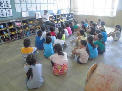 今週は読書週間です。今日は1年生に羽田先生が,4年生に校長先生が読み聞かせをしてくれました。子どもたちは熱心にお話に耳を傾けていました。