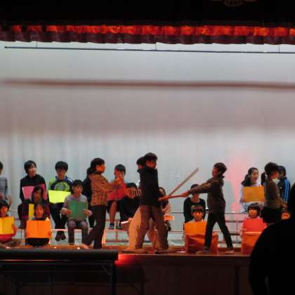 6年生は,学習発表会で「泣いた赤鬼」をします。監督からキャストまで,全て6年生の子どもたちの手で行います。声の大きさや動作の仕方など,みんなの力で仕上げています。