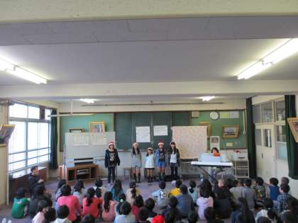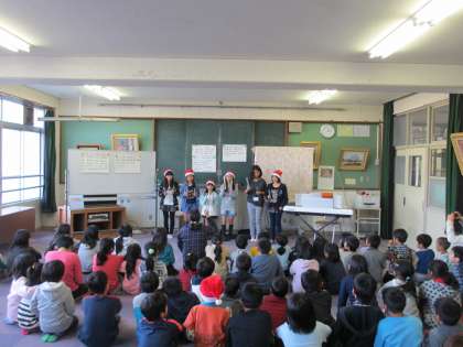 12月14日(月),昼休みにコーラス部のクリスマスコンサートを行いました。トーンチャイムでの演奏やクリスマスソングを歌いました。たくさんの子どもたちも見にきてくれました。