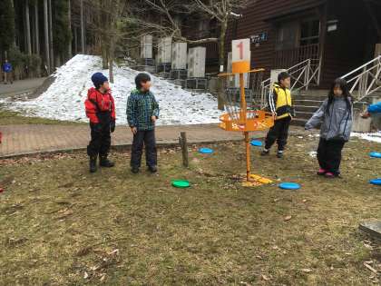 フライングディスクゴルフです。フライングディスクを指定の位置からカゴを目がけてとばします。この後はプレイホールでドッジボールをします。