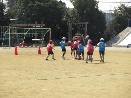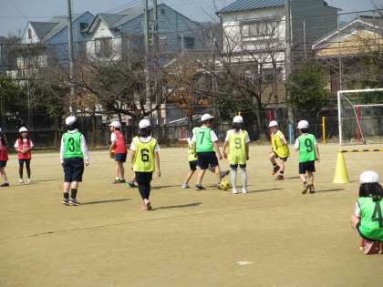3月3日(木),2年生は体育で「ボールけりゲーム」をしています。今日が2回目の学習になります。班ごとに準備をし,体操をしてから,試合をしました。2回目とは思えないほど,みんな力を合わせて動くことができていました。