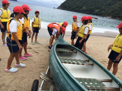 午前の選択活動(カヌー・ボート)に向けて,グループで協力をして準備をしていた(写真)のですが,波が高くなってきたため中止となりました。子どもたちも少し残念そうですが,午前は「思い出の万華鏡」づくりをおこないます。