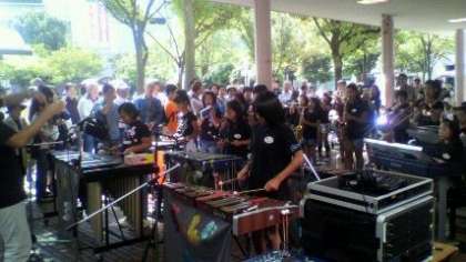 午前11時から,京阪古川橋駅前で「すいんぐきっず」が50分間,演奏しました。道行く人たちも,足を留めて聴き入ってくださいました。