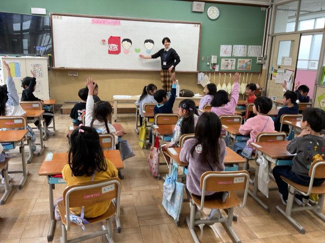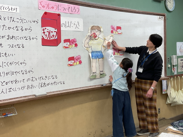給食指導で「牛乳のはたらき」について学習しました。栄養教諭の藤川先生から牛乳の4つのはたらきについて教えていただきました。ミルクマンのパワーで「きんにく」「ほね」「は」「ち」をつくる働きをすることを知りました。「これからも、ちゃんと牛乳を飲んで歯や骨を強くしたいです。」「12本飲んで,筋肉を強くします。」「飲みすぎもいけないから、気をつけます。」と感想を発表しました。牛乳だけでなく、ご飯もおかずもおかわりして、もりもり食べている1年生です。もちろん、食缶は毎日空っぽです。小学校で給食を食べる前は、苦手だった食材も、みんなと一緒なら食べられるようになった子どもも多いようです。『牛乳が苦手だったけど、飲めるようになったよ。』『苦手だった、にんじん・ピーマンの味がおいしく感じたよ。』という声も。これからもおいしい顔で、いただきます!