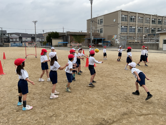 体育では「パスゲーム」の学習をしています。「友達が取りやすいように渡してあげるのがパスです。」と話すと、「優しい気持ちでボールをつなぐといいね!」とパス練習をしていました。パスの意味が分かったところでまずは、ボールを落とさないようにパスをつなぎ、ゴールまで運ぶ学習からスタートしました。うまくパスができなかった時も、友達を責めるのではなく「次、頑張ろう。」と励まし合いながら進めることができました。しばらく練習するとパスがつながるようになったので、パスを邪魔する「じゃまじゃまさん」を入れてパスをすることにしました。ふりかえりでは、「邪魔されてパスしにくかったけれど、ゴールまで行けて楽しかった。」「じゃまじゃまするのが楽しかった。」と発表していました。