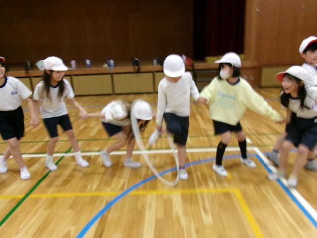 フラフープリレーでは体を上手に使ってフラフープを送っていました。
