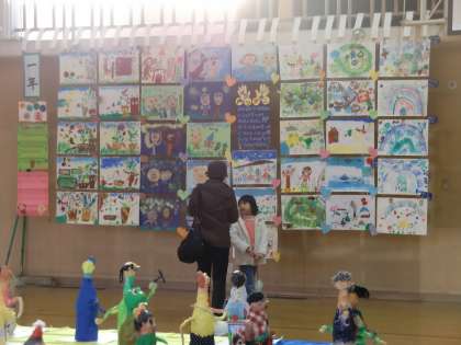 体育館にて「図工展」がはじまりました。子どもたちの思いのこもった作品を展示しています。ぜひ,ご覧ください。