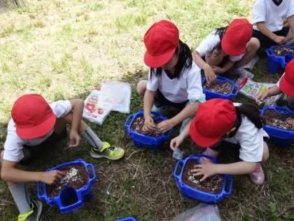 子どもたちは,鉢植えに土を入れ,丁寧にアサガオを植えていました。