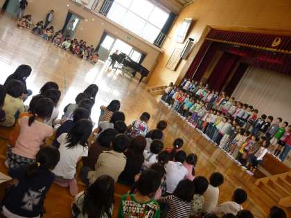1年生をむかえる会がありました。去年おむかえしてもらってからあっという間の1年!!今年はおむかえする番です。他の学年の発表を見る姿も去年と比べて大きく成長しました。そして,2年生の発表も大成功!!さすが2年生!!