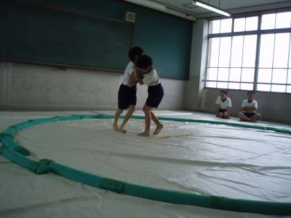 雨が続き,運動場での体育ができなかったので,室内でできる『すもう』に挑戦しました。みんなのがんばる姿に,応援にも力が入り,大盛り上がりでした!!土俵に入るときにはきちんと礼をすることなど,すもうという文化にも触れることができたのではないかと思います。