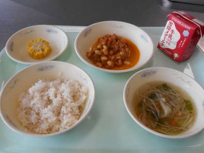 10月7日の献立は,「麦ごはん・牛乳・大豆とツナのドライカレー・カットコーン・スープ」でした。