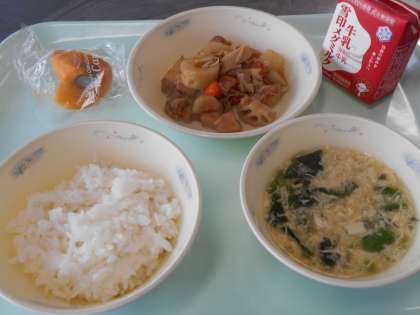 11月6日の献立は,「ごはん・牛乳・筑前煮・かきたま汁・柿」でした。