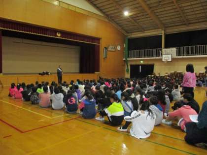 訓練後,全校で体育館に集まり,警察署の方から不審者についての話を聞かせていただきました。子どもたちは真剣な表情で聞いていました。教職員にとっては,どのように連携して行動するべきかを確認できる良い機会になりました。
