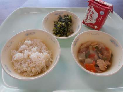 12月16日の献立は,「麦ごはん・牛乳・厚あげのふきよせ煮・だいこん葉のごまいため」でした。