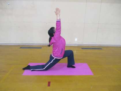 3枚目のポーズは,ヨガの「三日月のポーズ」です。肩甲骨や股関節等全身を伸ばすことができます。ゆとりのある方は,さらに手を後ろへ反らし目線も後方へもっていきます。無理はしないようにしてくださいね。