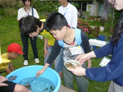 科学センターに行きました。屋外学習では、ザリガニつりやドジョウすくい、フナすくいをしました。生き物を優しく扱うことができました。
