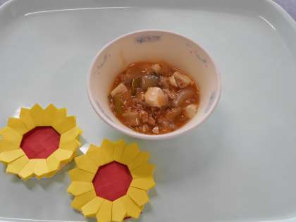 “とうふの四川風”は,トウバンジャンを使ってピリ辛に仕上げました。給食では,子どもたちも食べやすいように,かなりマイルドな辛さにしています。