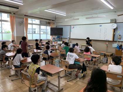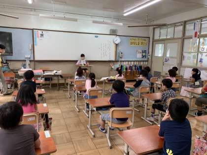 1年生のみんなとなかよくなるために,一緒に遊びを計画したいところですが,今はそれもできないので,せめても…ということで,5年生の2人が1年生2クラスに紙芝居を読みに行くことにしました。