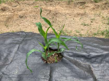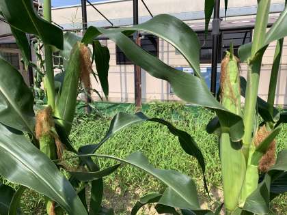 それからはあっという間に大きくなり,普通のトウモロコシならば食べたいな,と思うほどの大きさに成長。でも,イエローポップはポップコーンにするための品種なので,実についているひげが茶色くなり,十分熟すまで待たねばなりません。