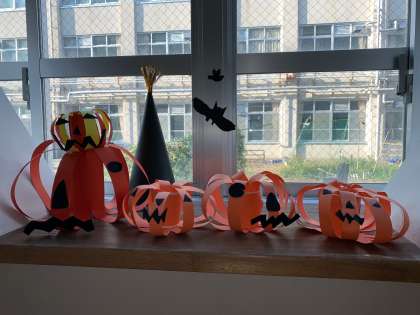 ハロウィンを間近に控え,ひまわり学級でもカボチャを作ってみました。個性のある顔のカボチャができて,とっても素敵。子どもたちからの提案で,コウモリも作りました。黒い帽子も一緒に飾ると素敵な窓辺になりました。