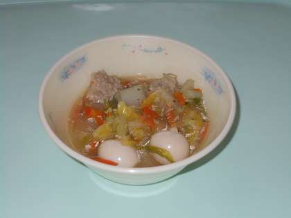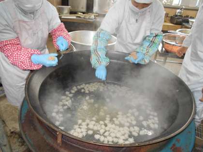 “肉だんごのスープ煮”は,給食室で豚ひき肉にたまねぎ,しょうがなど混ぜ合わせて作った手作りの肉だんごが入ったスープ煮です。肉だんごは,一つずつ丸めながら,スープの中に入れていきます。はくさいやにんじん,はるさめ,うずら卵も入っているので,肉だんごだけでなく,野菜の甘みやうまみ,いろいろな食感が味わえます。