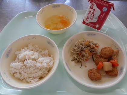 11月9日の献立は,「麦ごはん・牛乳・平天とこんにゃくの煮つけ・切干大根の三杯酢・フルーツ寒天」でした。
