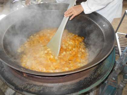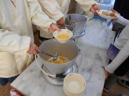 “フルーツ寒天”は,子どもたちが教室まで運ぶときには,液状です。食器に盛りつけた後,温度が下がることで固まり始めます。固まる様子も楽しめる手作りデザートです。