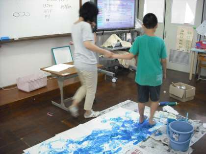 次に,作った海の生き物を海に泳がせようということでボンドやのりを使って貼り付けました。協力してとても素敵な作品ができました。