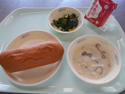 11月27日の献立は,「黒糖コッペパン・牛乳・きのこのクリームシチュー・ほうれん草のソテー」でした。
