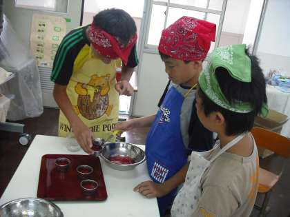 9時からゼリー作りをしました。ゼリーの粉をお湯で溶かしてよく混ぜ,容器につぎわけました。冷やしている間に万願寺唐辛子の収穫をして,草抜きをしました。その後,プールに入りました。