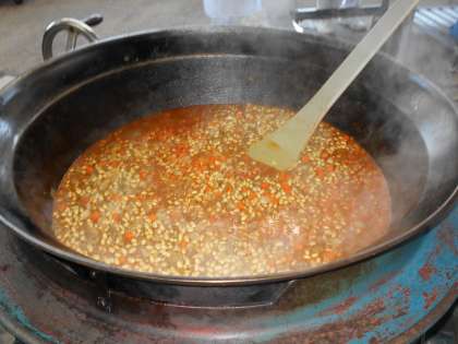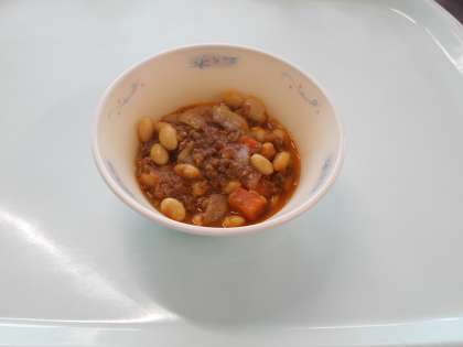 “チリコンカーン”はアメリカの料理です。本来はいんげん豆やうずら豆を使用しますが,給食では大豆を使います。ひき肉と大豆を煮込み,料理酒・トマトケチャップ・さとう・カレー粉などで味つけをして作りました。豆料理の中でも人気メニューです。大豆はたんぱく質が豊富で,カルシウム・鉄・ビタミンB1・食物繊維も含まれています。家でも進んで取り入れて欲しい食材です。