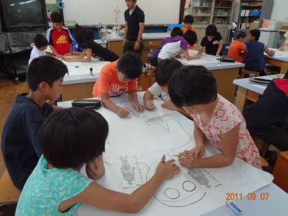 模型を見たり、自分の体を触ったり、確認しながら模造紙にかきこんでいます。