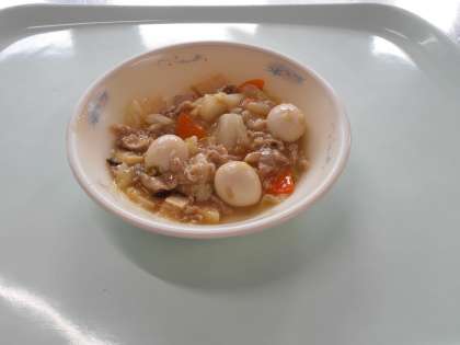 “うずら卵とキャベツのいため煮”には,豚肉・キャベツ・にんじん・たけのこ・しいたけ・うずら卵を使いました。いろいろな食材の味わいや食感を楽しめる献立です。