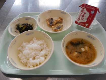10月13日の献立は,「ごはん・牛乳・とびうおのこはくあげ・小松菜とひじきのいためもの・みそ汁」でした。