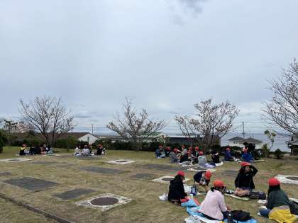 野島断層保存館の庭で海を横目にお弁当タイムです。