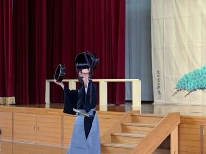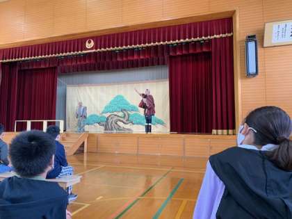 ようこそアーティストの取組により,狂言師の茂山忠三郎家のみなさまに来ていただきました。はじめに狂言の起源や,「かづらおけ」について教えていただきました。その後「柿山伏」の演目を見せていただいたり,狂言特有の「笑い方」や「歩き方(すり足)」の体験をさせていただいたりしました。