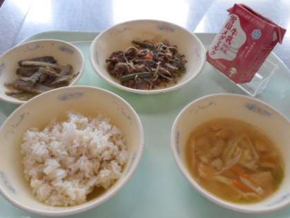 1月17日の献立は,「麦ごはん・牛乳・牛肉のしぐれ煮・たたきごぼう・キャベツの吉野汁」でした。