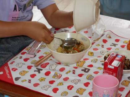 “夏野菜のあんかけごはん(具)”は,あま味のある万願寺とうがらしと,みずみずしいなすを油で揚げ,鶏ひき肉・しょうが・たまねぎ・にんじんといっしょにけずりぶしのだしで煮て,最後に片くり粉でとろみをつけました。だしのうま味としょうがの香りでごはんがすすむ献立でした。