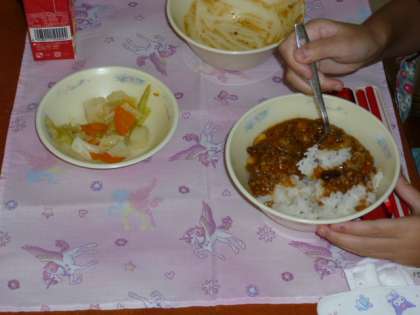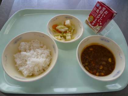 子どもたちは、教室でキーマカレーをごはんにかけて食べました。味・香り・食感ともに楽しめる献立です。