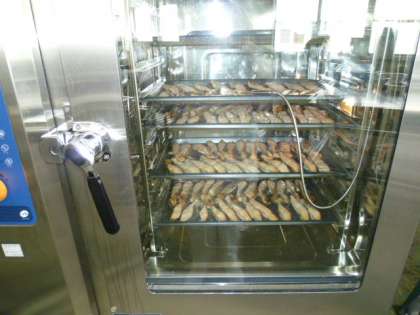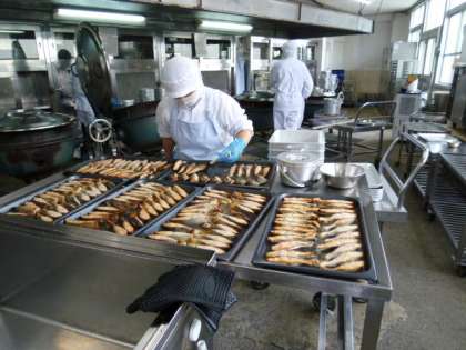 “さけの塩こうじ焼き”は、てらし切りのさけを、発酵調味料の塩こうじにつけ込み、スチコンで焼きました。塩こうじにつけることでさけの身がやわらかくなります。さらに焼いた時には、さけの表面についた塩こうじが一緒に焼けることで、少し甘みのある香ばしい香りが広がります。